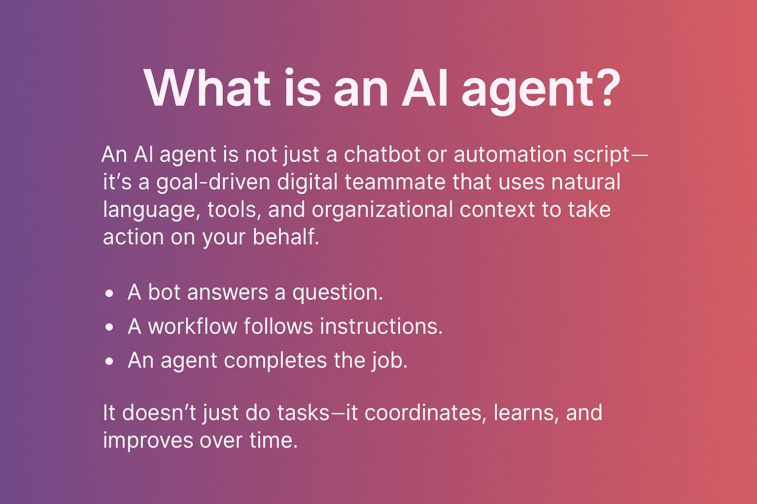 It’s a goal-driven digital teammate that uses natural language, tools, and organizational context to take action on your behalf.